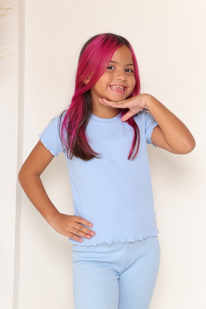 Azul que combina com tudo! O azul é o novo preto! Um clássico que traz um toque moderno e descolado ao visual, perfeito para qualquer ocasião — desde festinhas até passeios no parque. Com essa camiseta, o charme está garantido!